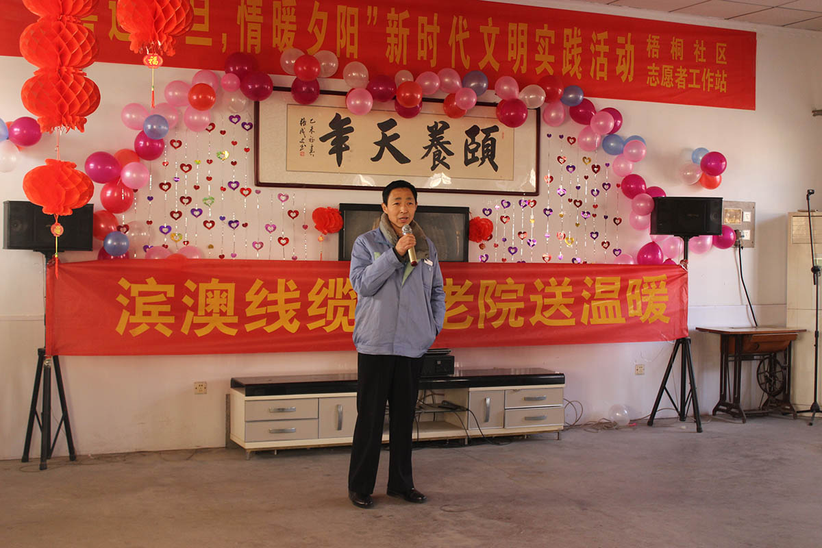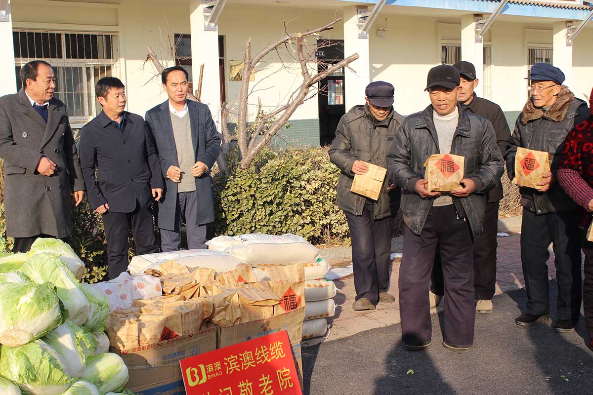 2018年12月29日,濱北辦事處人大委員會(huì)主任王孟峰、副主任王霞以及山東濱澳電線電纜有限公司總經(jīng)理、濱城區(qū)工商聯(lián)副會(huì)長董桂光等一行人來到濱北中心敬老院看望慰問生活在那里的老人和工作人員,濱澳線纜并為他們送上蔬菜、米、面等慰問品。同時(shí)為每位老人準(zhǔn)備了一份節(jié)日禮物。